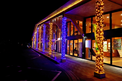 とはいえ、山地の入り口にある小さな町で、午後6時ともなると駅の周りはもう真っ暗という感じ。ただ、モダンな造りで非常に立派な郡家駅の駅舎では見事なイルミネーションが行われていて、ここだけはまさにクリスマスムード。駅の中にはミニコンビニなどがあり、広いフリースペースには地元の学生がたくさん集まって、地域の中心となっているようでした。ここで特急への乗り換え待ちをすることになっていましたが、正直ほっとしました。